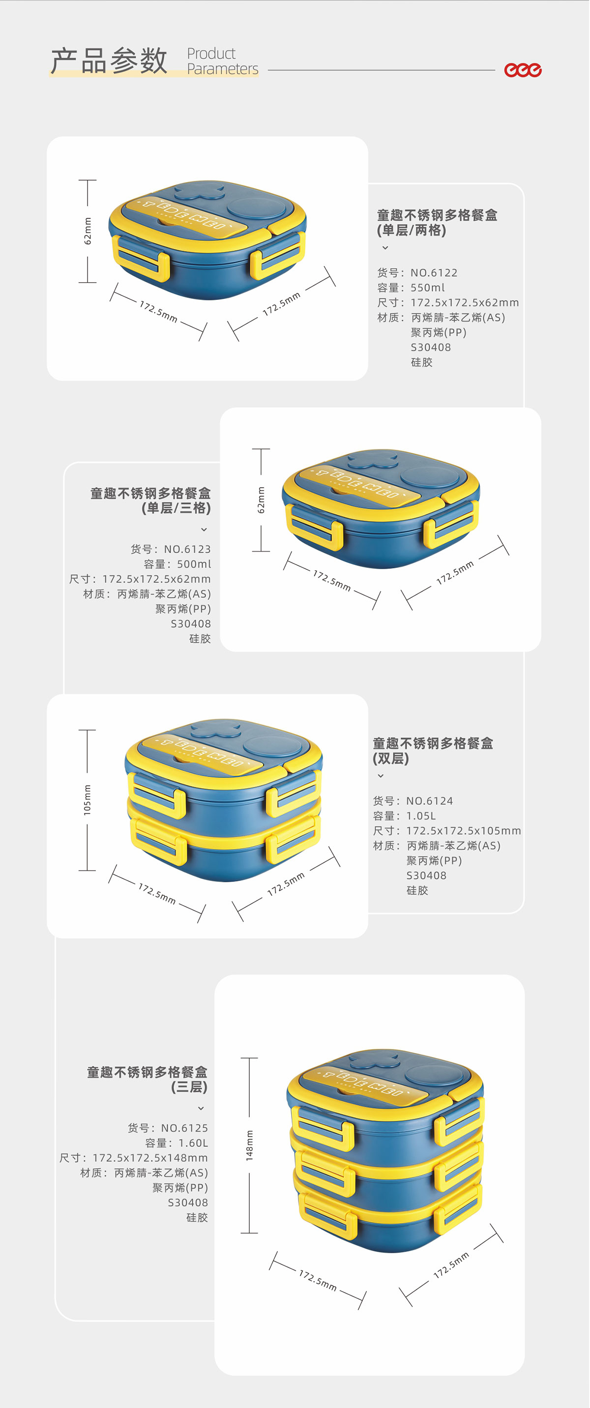 Size: HM-6122(單層餐盒(兩格)):173*173*62mm