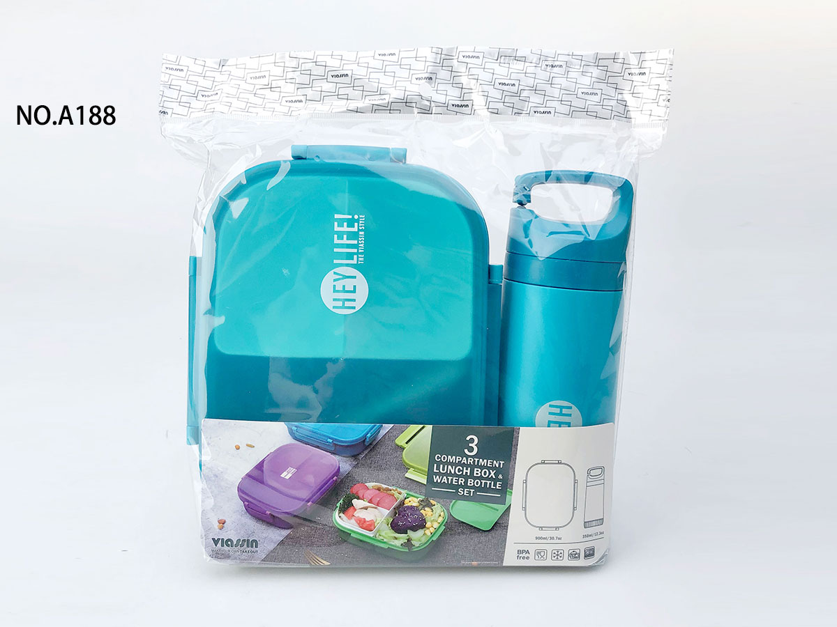 紋彩密封3格飯盒+水壺OPP袋/PVC袋套裝(長方形900+350ml)