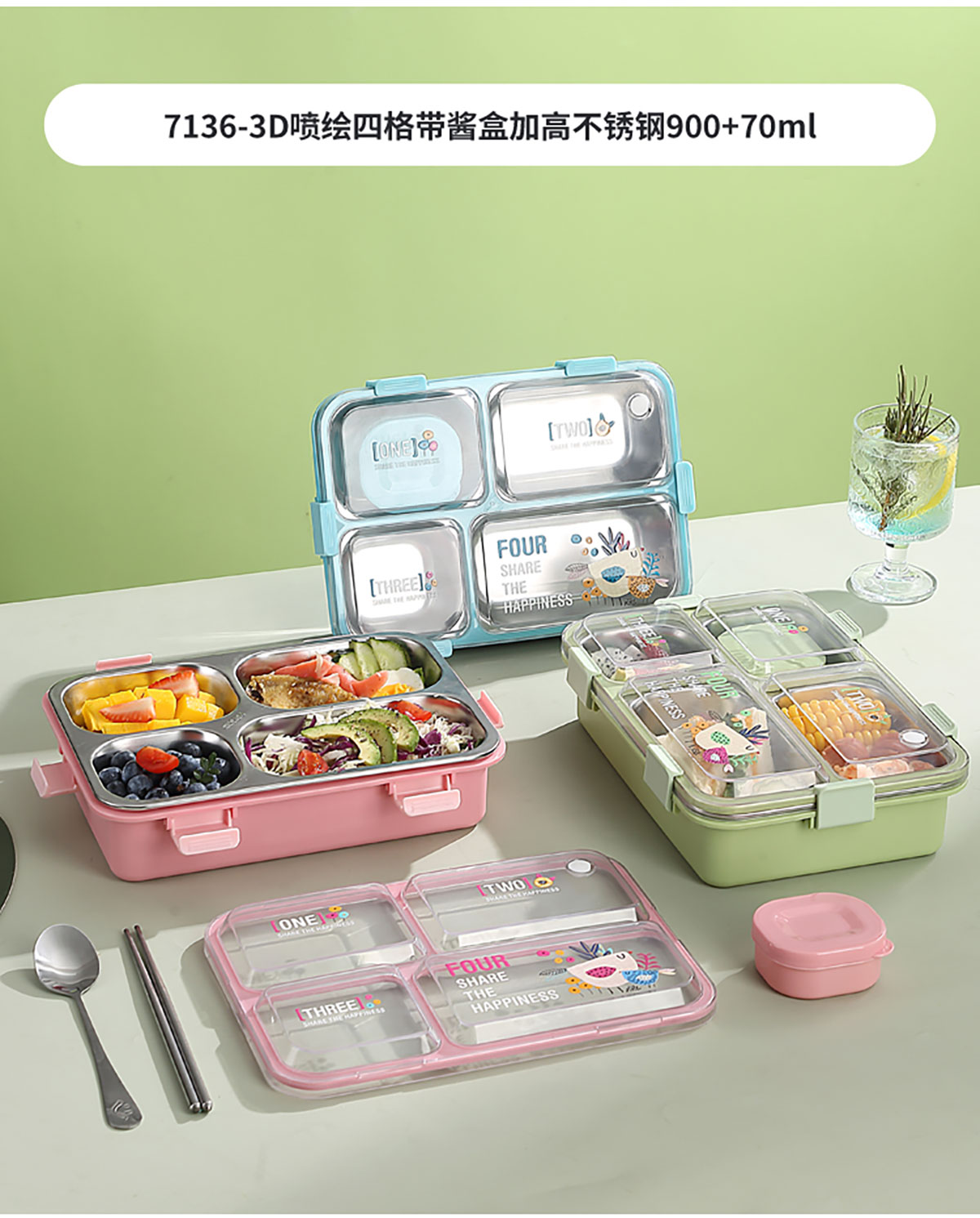 3D噴繪大三格/四格帶醬盒/四格帶碗加高不銹鋼餐盒