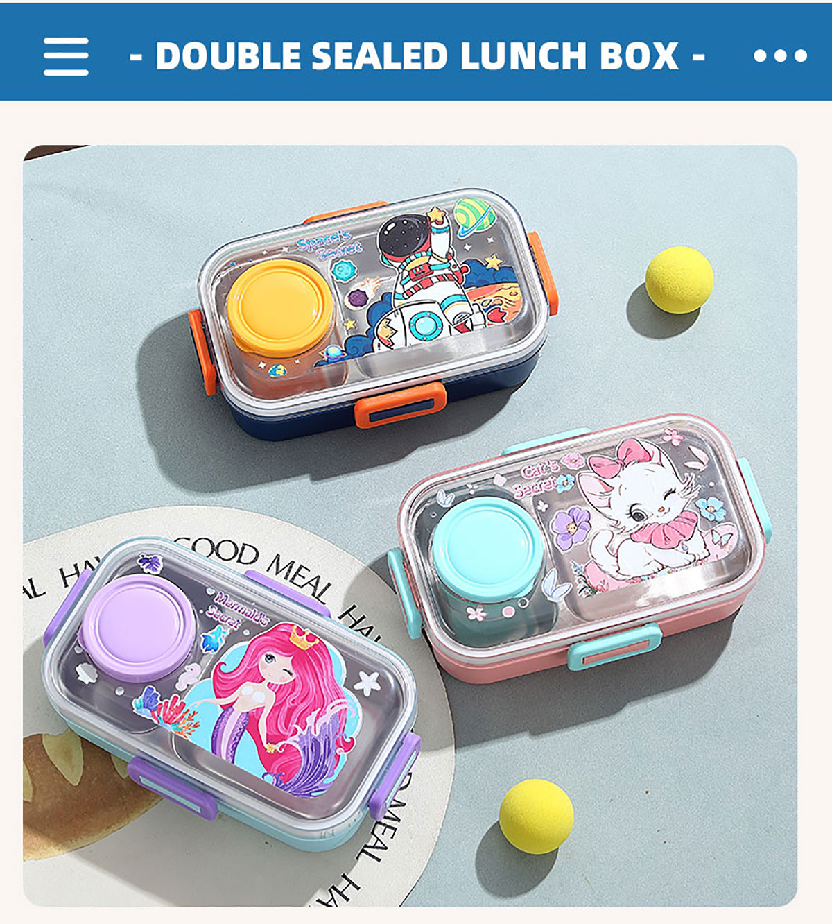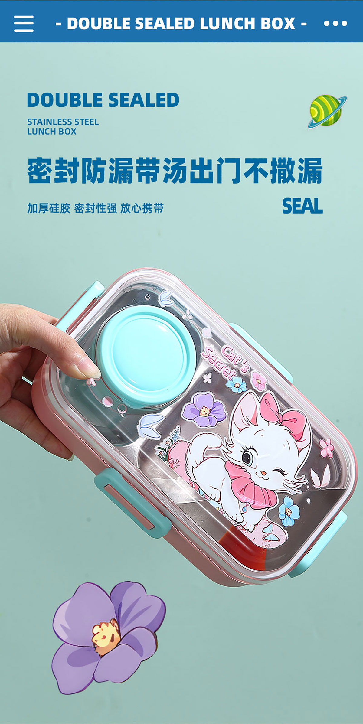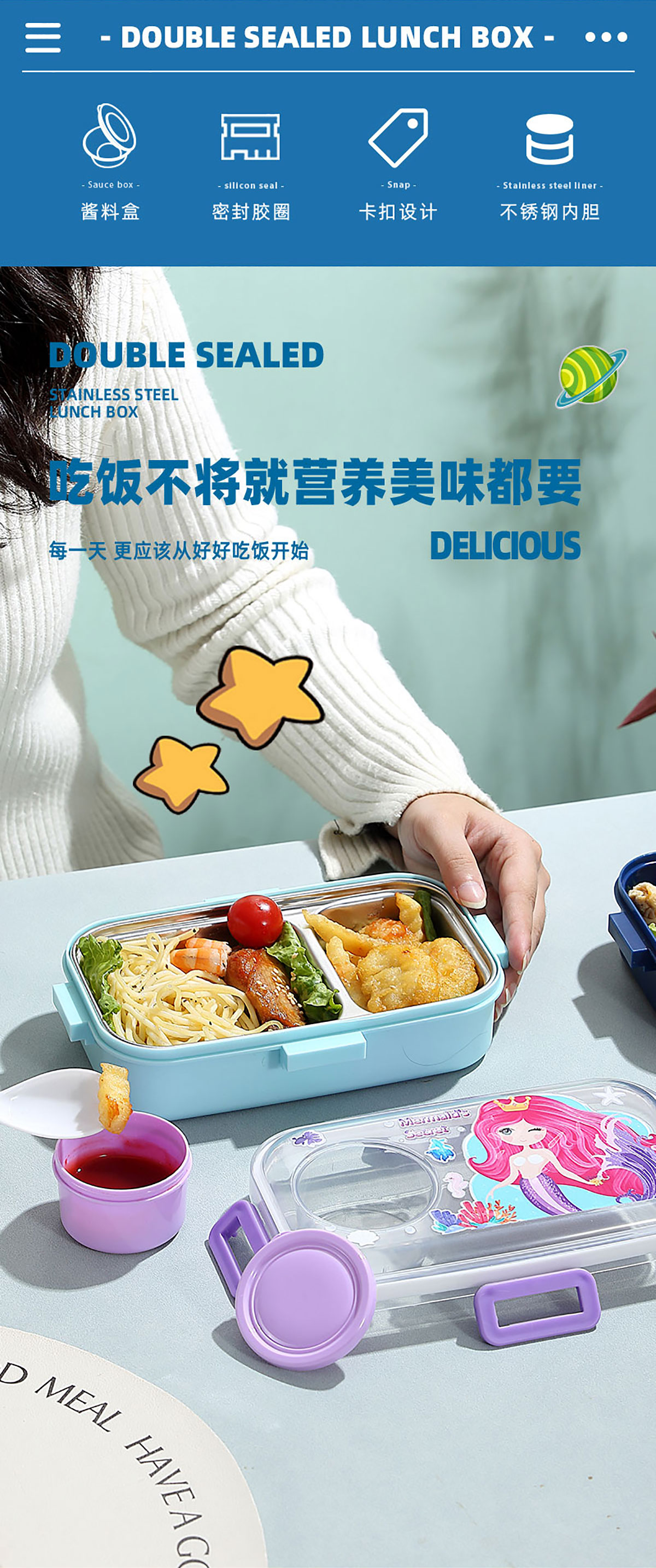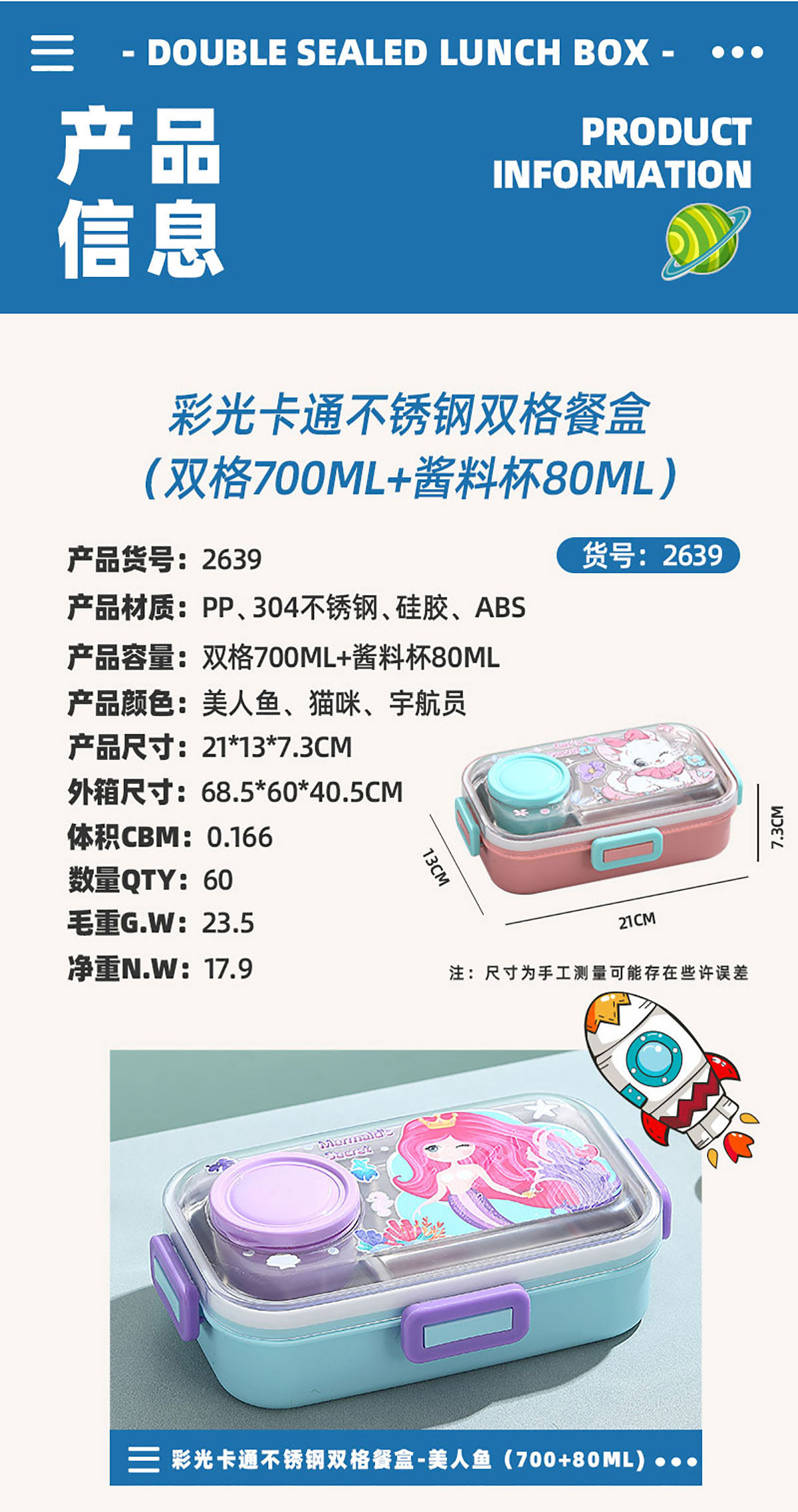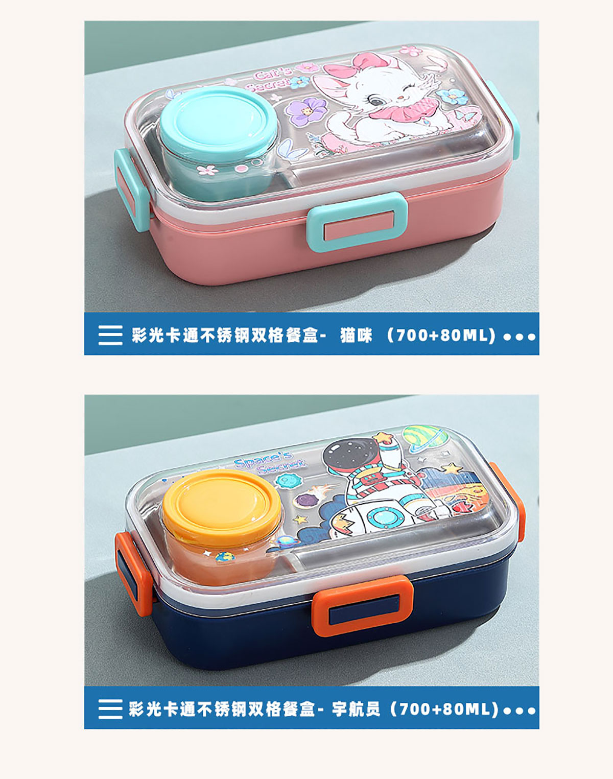 彩光卡通不銹鋼餐盒(二格700ml+外置醬料杯80ml)