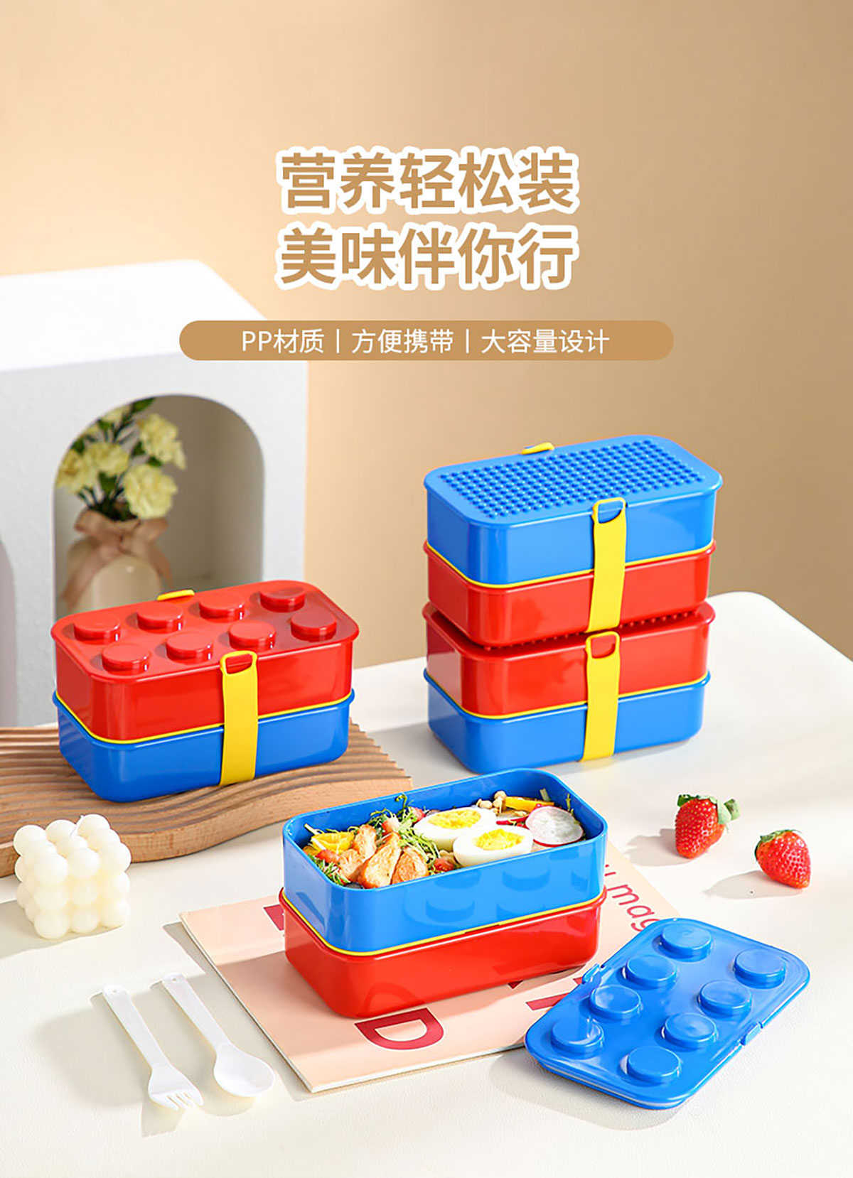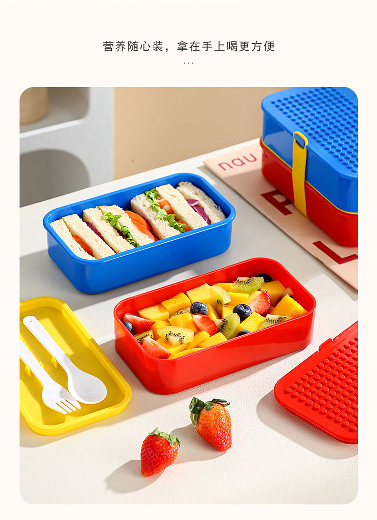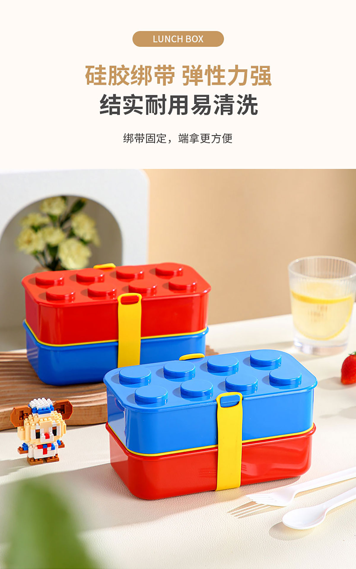 積木雙層綁帶飯盒A款/B款(配叉+勺)1100ml